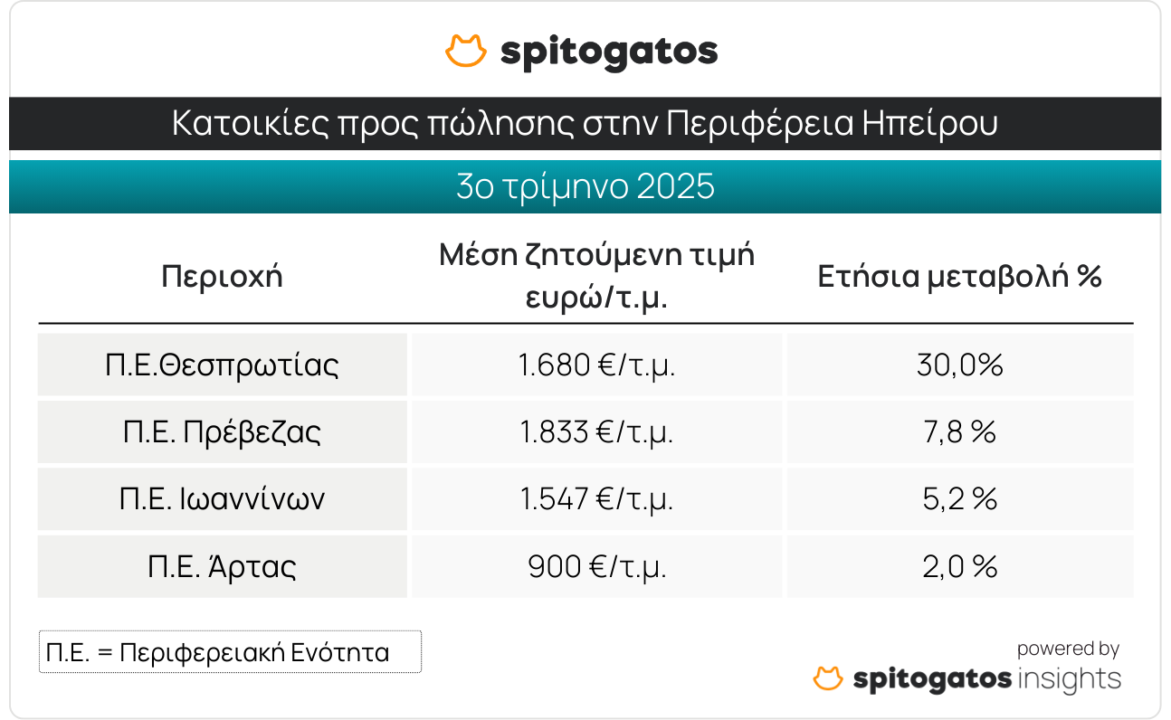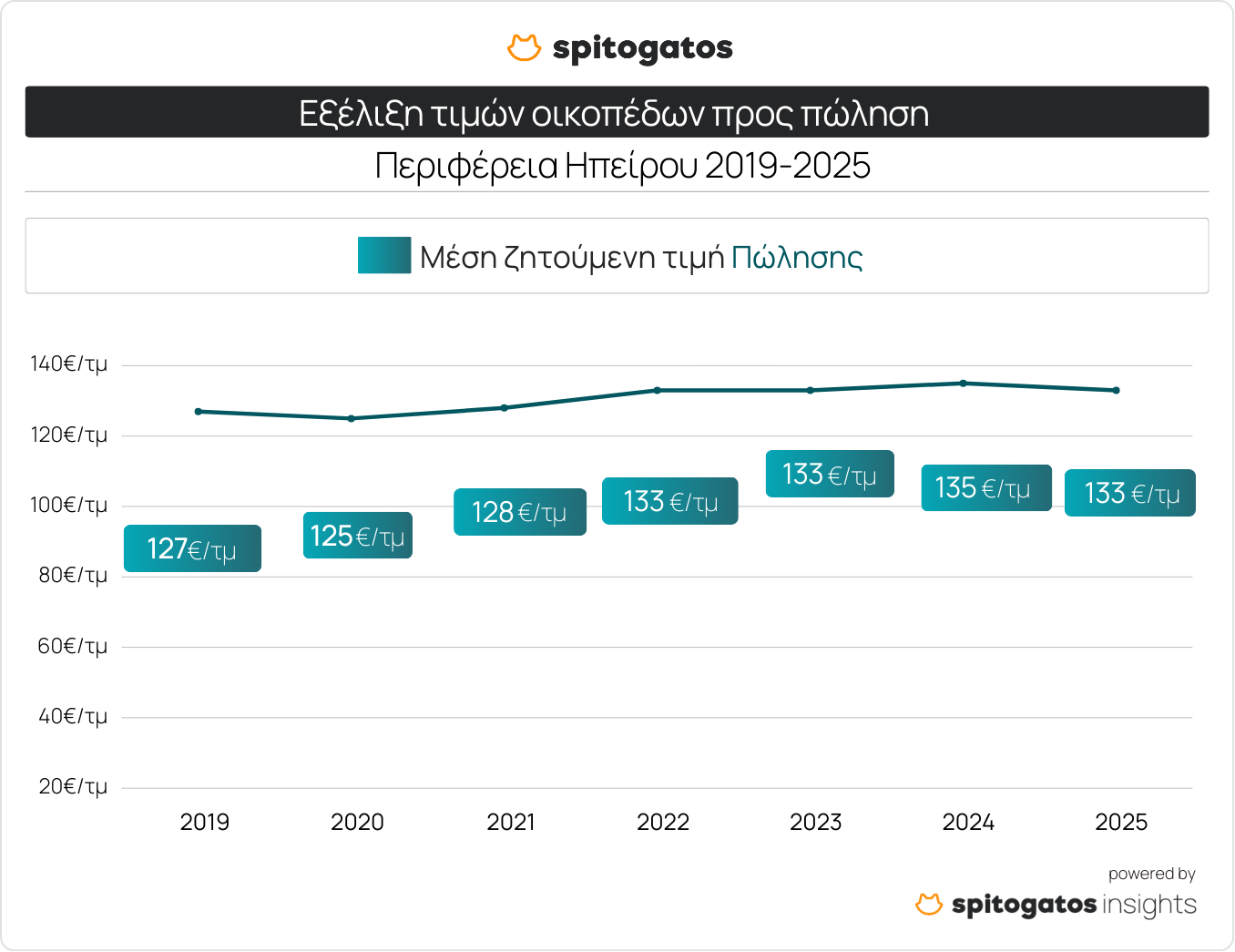 Κατά την περίοδο 2019-2025, η κτηματαγορά στην Περιφέρεια Ηπείρου παρουσιάζει σημαντική άνοδο, με τη Μέση Ζητούμενη Τιμή (ΜΖΤ) κατοικιών προς πώληση να έχει αυξηθεί συνολικά κατά 41%. Επιπλέον, το 2025 η ΜΖΤ εμφανίζεται αυξημένη κατά 7,3% σε σύγκριση με το 2024.