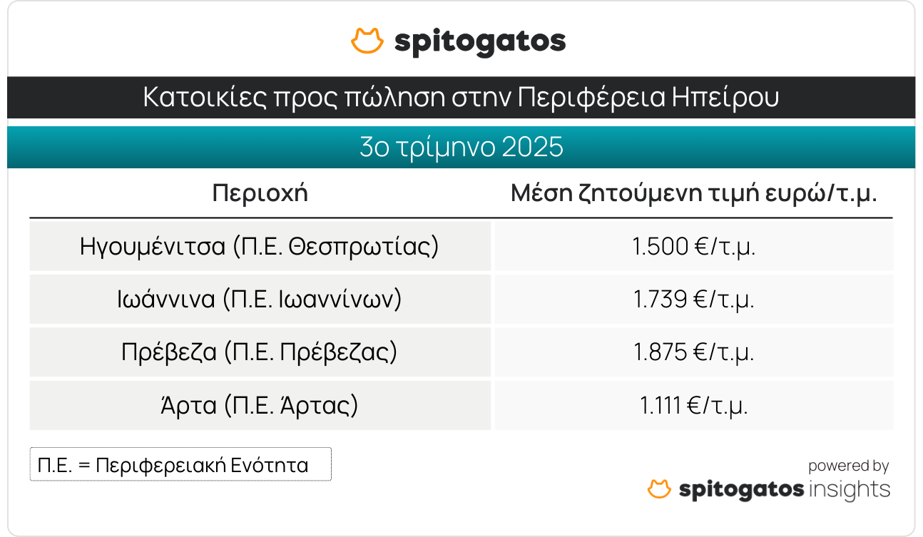 Εμβαθύνοντας στις μεγάλες πόλεις των Π.Ε, της Ηπείρου, παρατηρούμε ότι όσον αφορά τις κατοικίες προς πώληση, η Πρέβεζα (Π.Ε. Πρέβεζας) παρουσιάζει την υψηλότερη μέση ζητούμενη τιμή κατά το 3ο τρίμηνο του 2025.