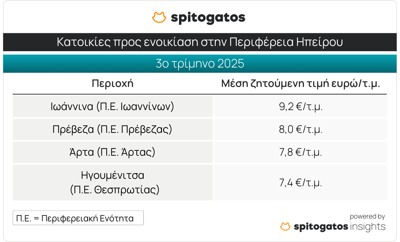 Αντίθετα, στην Ηγουμενίτσα (Π.Ε. Θεσπρωτίας) συναντάμε τη χαμηλότερη ΜΖΤ ενοικίασης κατά το 3ο τρίμηνο του 2025. Σημαντική αύξηση 17,1% σημειώνεται στην Άρτα (Π.Ε. Άρτας), όπου η ΜΖΤ ενοικίασης για κατοικία ανέρχεται στα 7,8 ευρώ/τ.μ.
