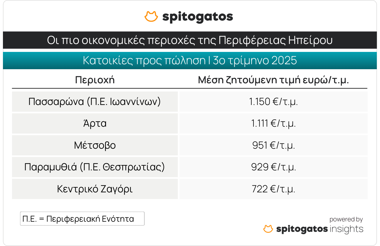 Σύμφωνα με τα στοιχεία, τα πέντε πιο οικονομικά σημεία της Περιφέρειας Ηπείρου για αγορά κατοικίας είναι η Πασσαρώνα (Π.Ε. Ιωαννίνων) με ΜΖΤ στα 1.150 ευρώ/τ.μ.