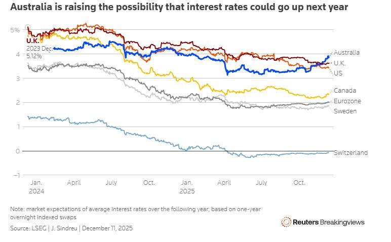 Η πιο εντυπωσιακή ανατροπή παρατηρείται στην Αυστραλία, όπου οι αγορές έχουν μετατοπιστεί από την προσδοκία μειώσεων στην πεποίθηση ότι η πολιτική θα γίνει πολύ πιο αυστηρή με ιλιγγιώδη ταχύτητα.