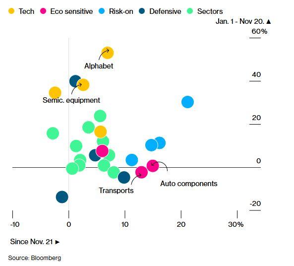 Υπάρχουν ήδη ενδείξεις ότι οι υπερβολικές αποτιμήσεις αρχίζουν να περιορίζουν το ενδιαφέρον των επενδυτών για τους κάποτε ασταμάτητους τεχνολογικούς γίγαντες. Οι ροές στρέφονται προς υποτιμημένες κυκλικές μετοχές, μετοχές μικρής κεφαλαιοποίησης και ευαίσθητα στην οικονομία τμήματα της αγοράς, καθώς οι επενδυτές τοποθετούνται έτσι ώστε να επωφεληθούν από την αναμενόμενη ώθηση της οικονομικής ανάπτυξης το επόμενο έτος.