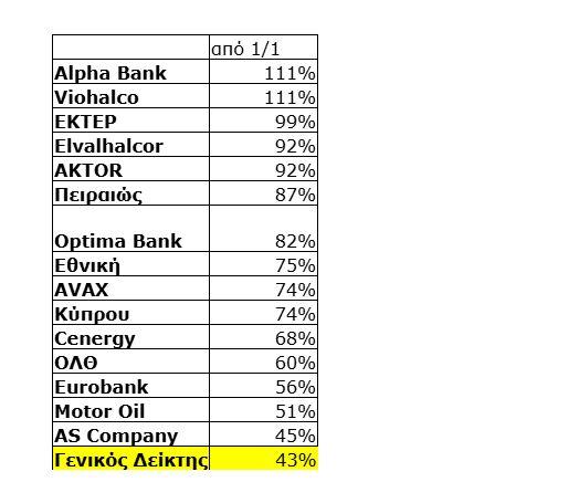 Στην κορυφή της λίστας βρίσκονται λοιπόν η Alpha Bank και η Viohalco, με τις δύο εταιρείες να σημειώνουν ισχυρές επιδόσεις και να καταγράφουν απόδοση 111% από την αρχή του έτους. Η πρώτη είχε ένα εντυπωσιακό οκτάμηνο, αλλά από τον Σεπτέμβριο οι ρυθμοί της έχουν μειωθεί, ενώ η δεύτερη έχει διαγράψει μια εντυπωσιακή πορεία τους τελευταίους τρεις μήνες, θέτοντας όλον τον όμιλο, μαζί με τις θυγατρικές της, στο προσκήνιο.