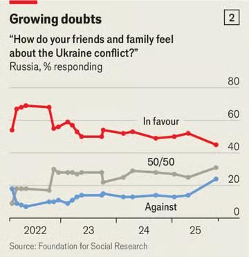 Η αλλαγή είναι ακόμη πιο εμφανής στη στάση απέναντι στους βετεράνους της «ειδικής στρατιωτικής επιχείρησης». Η επίσημη προπαγάνδα τους παρουσιάζει ως ήρωες πολέμου. Ωστόσο, μια πρόσφατη έρευνα της Levada, μιας ανεξάρτητης εταιρείας δημοσκοπήσεων, διαπίστωσε ότι μόνο το 40% των Ρώσων τους βλέπει με αυτόν τον τρόπο. Η πλειοψηφία τους θεωρεί απειλητικούς ή θύματα. Ο πόλεμος, ο οποίος μέχρι τον Ιανουάριο θα έχει διαρκέσει περισσότερο από τον αγώνα της Ρωσίας κατά των Ναζί το 1941-45, δεν εμπνέει ούτε υπερηφάνεια ούτε αισιοδοξία.
