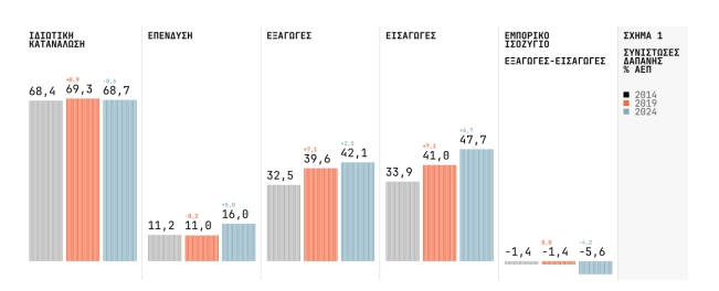 Στη δεύτερη πενταετία (2019-24) υπήρξε μείωση του μεριδίου των μισθών και ταχύτερη αύξηση των επενδύσεων, η σύνθεση των οποίων δεν συνεισφέρει ιδιαίτερα στην παραγωγική δυναμικότητα της οικονομίας.