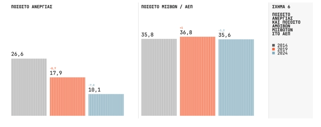 Το 2014 οι αμοιβές των μισθωτών ήταν 35,8% του ΑΕΠ και αυξήθηκαν στο 36,8% του ΑΕΠ το 2019 (+1 μονάδα) αλλά το 2024 μειώθηκαν σε 35,6% του ΑΕΠ (-1,2 μονάδες), κάτω από το ποσοστό του 2014.