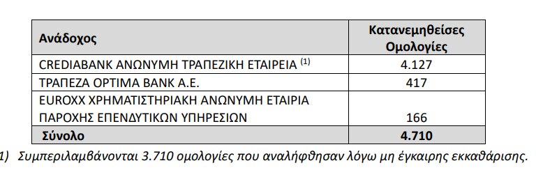 Επίσης, από τις 65.000 ομολογίες που κατανεμήθηκαν σε ειδικούς επενδυτές, οι Ανάδοχοι έλαβαν για δικό τους λογαριασμό 4.710 ομολογίες ως ακολούθως: