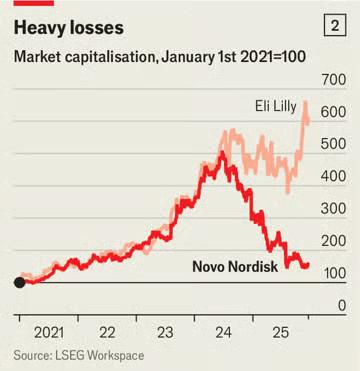 Οι επενδυτές της δανικής φαρμακευτικής εταιρείας είναι ταραγμένοι. Η χρηματιστηριακή αξία της, που ανέρχεται σε περίπου 1,4 τρισ. κορώνες Δανίας (220 δισ. δολάρια), έχει μειωθεί κατά τα δύο τρίτα από το υψηλότερο σημείο που έφτασε τον Ιούνιο του 2024, όταν ήταν η πιο πολύτιμη εταιρεία της Ευρώπης (βλ. διάγραμμα 2).