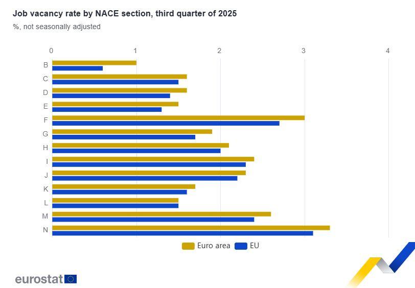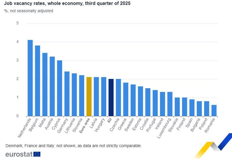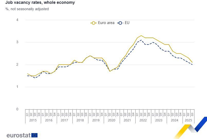 Το ποσοστό κενών θέσεων εργασίας συνολικά στην ΕΕ ήταν 2,0% το τρίτο τρίμηνο του 2025, σημειώνοντας πτώση από 2,1% το δεύτερο τρίμηνο του 2025 και από 2,3% το τρίτο τρίμηνο του 2024.