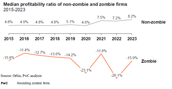Όπως σημειώνει ο Κυριάκος Ανδρέου, Partner, Strategy & Markets στην PwC Ελλάδας, «η βελτίωση της οικονομικής συγκυρίας ενίσχυσε την κερδοφορία των επιχειρήσεων και συνέβαλε στη μείωση του αριθμού των επιχειρήσεων ζόμπι. Η υποχώρηση αυτών των μη βιώσιμων επιχειρήσεων λειτούργησε με τη σειρά της θετικά για την οικονομία, καθιστώντας τις ελληνικές επιχειρήσεις πιο ανθεκτικές και πιο ελκυστικές για επενδύσεις».