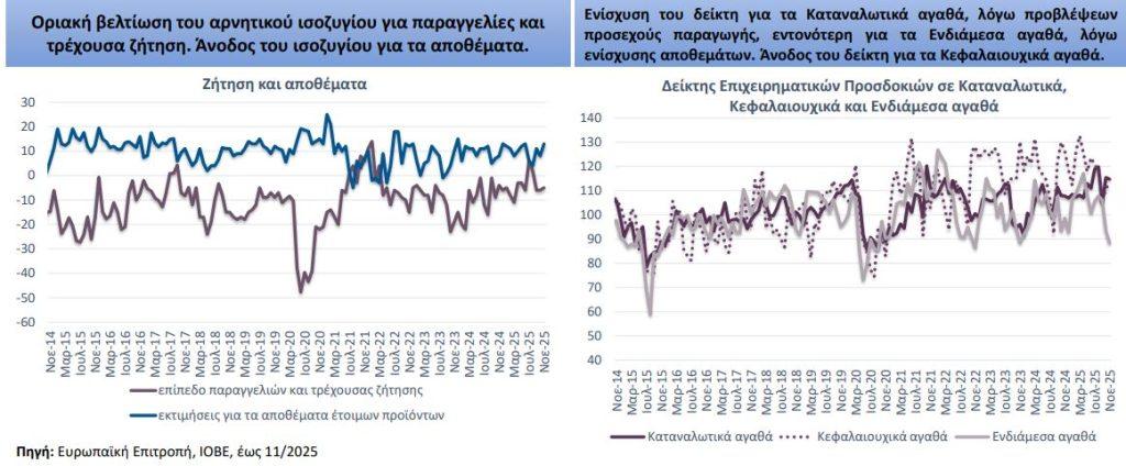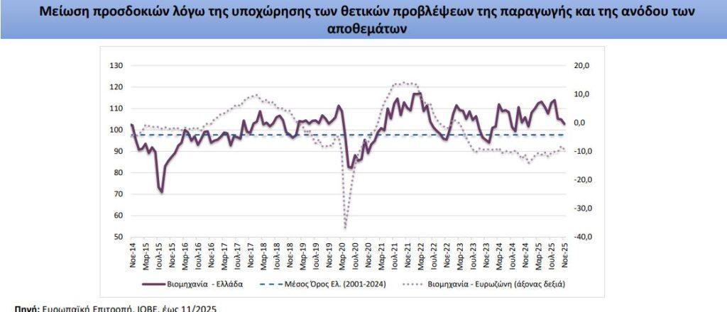 Υποχώρησαν οι επιχειρηματικές προσδοκίες στη βιομηχανία τον Νοέμβριο, λόγω της υποχώρησης των θετικών προβλέψεων της παραγωγής και της ανόδου των αποθεμάτων, σύμφωνα με το «Δελτίο Εξελίξεων στη Βιομηχανία» του ΙΟΒΕ για τον μήνα Δεκέμβριο του 2025.
