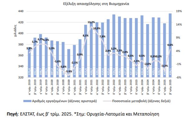 Όσον αφορά στην απασχόληση, καταγράφηκε αύξηση στη βιομηχανία το β΄τρίμηνο του 2025. Συγκεκριμένα η απασχόληση στη Βιομηχανία ενισχύθηκε κατά 4,6%, στα 436,1 χιλ. άτομα σε σχέση με το αντίστοιχο τρίμηνο του 2024.