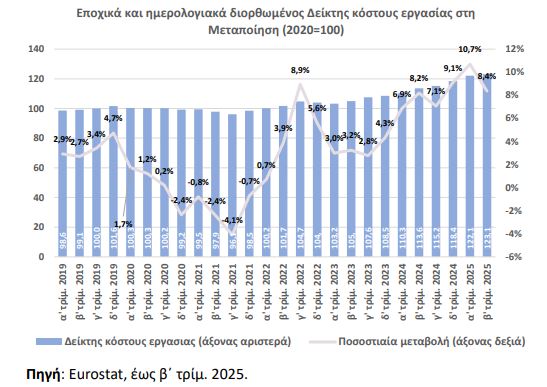 Ο δείκτης κόστους εργασίας στη Μεταποίηση ανήλθε στις 123,1 μονάδες το β’ τρίμ. του 2025, σημειώνοντας άνοδο 8,4% σε σχέση με ένα έτος πριν.