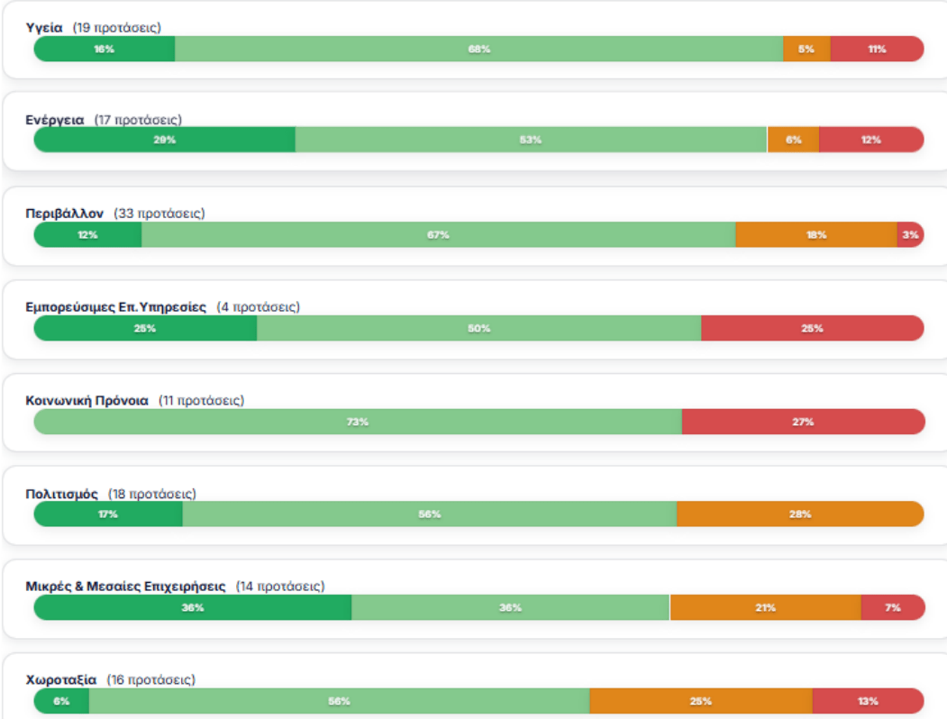 Από το σύνολο των προτάσεων, τα πεδία στα οποία έχει σημειωθεί η μεγαλύτερη πρόοδος αφορούν την Υγεία, την Ενέργεια και το Περιβάλλον. Η πιο σημαντική υστέρηση εμφανίζεται στα πεδία που αφορούν τις Εξαγωγές, τις Επιχειρήσεις και τον Ανταγωνισμό και τη Δημόσια Διοίκηση.