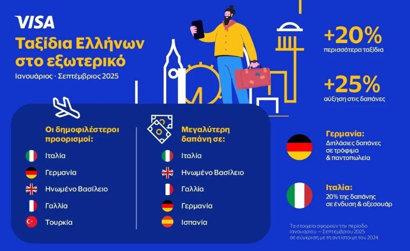 Ο αριθμός των Ελλήνων ταξιδιωτών στο εξωτερικό αυξήθηκε κατά σχεδόν 20% τους πρώτους 9 μήνες του 2025, σε σχέση με το αντίστοιχο διάστημα του 2024, σύμφωνα με στοιχεία της Visa. Τα στοιχεία έδειξαν επίσης ότι, την ίδια περίοδο, η συνολική δαπάνη αυξήθηκε κατά 20%. Η άνοδος στον αριθμό των ταξιδιωτών ήταν εντονότερη κατά τους θερινούς μήνες (Ιούνιο, Ιούλιο, Αύγουστο), οπότε και υπερέβη το 20%, ενώ οι συνολικές δαπάνες αυξήθηκαν κατά 25% στο ίδιο χρονικό διάστημα.