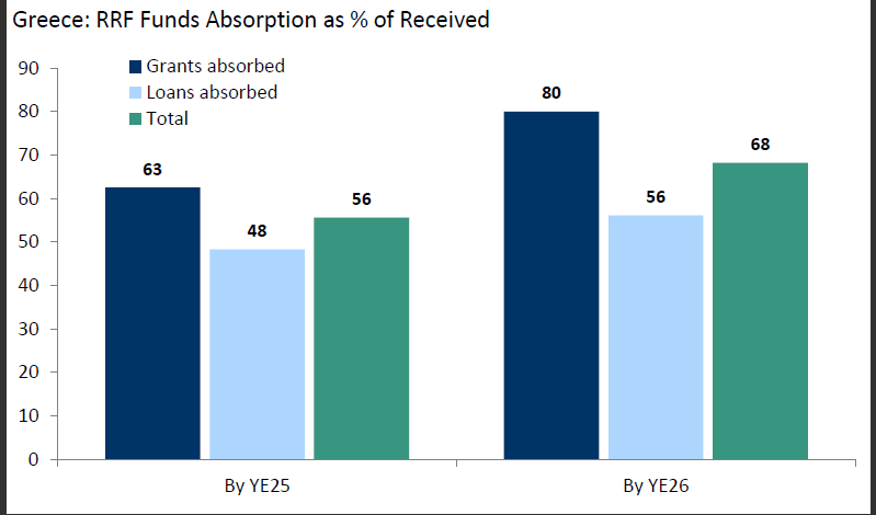 Εκτιμάται ότι μέχρι το τέλος του 2025 μόνο το 56% των ληφθέντων κονδυλίων θα έχει απορροφηθεί. Ως αποτέλεσμα, η ανάπτυξη των εταιρικών δανείων αναμένεται να παραμείνει ισχυρή μέχρι το 2027, λόγω αυτής της καθυστέρησης.