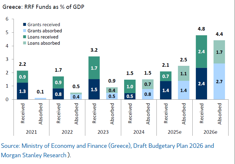 Το RRF έχει υποστηρίξει τις επενδύσεις και, παρά το γεγονός ότι το πρόγραμμα λήγει το Δεκέμβριο του 2026, αναμένεται ότι τα επίπεδα των επενδύσεων θα παραμείνουν ισχυρά και το 2027. Υπάρχει περίπου διετής καθυστέρηση μεταξύ της παραλαβής των κονδυλίων και της απορρόφησής τους, κάτι που δείχνει ότι η επενδυτική δυναμική θα παραμείνει ισχυρή ακόμα και μετά το 2026.