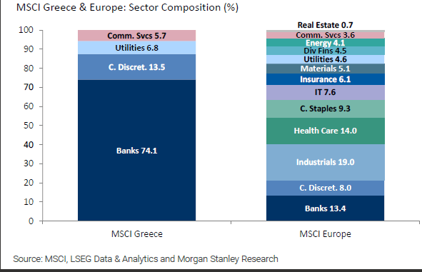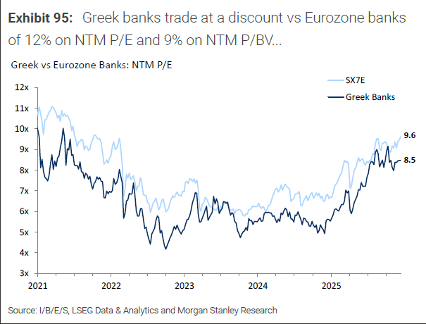 Οι ελληνικές τράπεζες, οι οποίες αντιπροσωπεύουν σχεδόν το ¾ του MSCI Greece, παρουσιάζουν ανθεκτική αναπτυξιακή προοπτική, και η Morgan Stanley θεωρεί ότι οι τράπεζες της ΕΕ ενδέχεται να επαναξιολογηθούν σε υψηλότερες αποτιμήσεις, φτάνοντας το 11-12 φορές την αναμενόμενη κερδοφορία (P/E), με ανοδική προοπτική 15-25%.