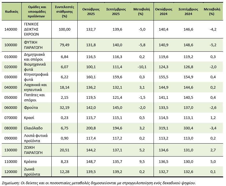 Η μείωση του Γενικού Δείκτη Τιμών Εκροών κατά 5,5%, τον μήνα Οκτώβριο 2025 σε σύγκριση με τον αντίστοιχο δείκτη του Οκτωβρίου 2024, οφείλεται: α) στη μείωση κατά 6,4% του δείκτη τιμών της φυτικής παραγωγής και κυρίως στη μεταβολή της ομάδας «Ελαιόλαδο», και β) στην αύξηση κατά 7,1% του δείκτη τιμών της ζωικής παραγωγής.