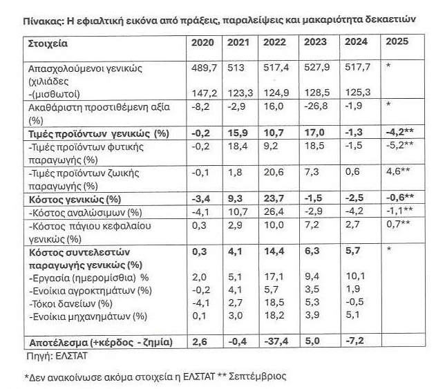 Η ταπεινότητά μου φρονεί ότι δεν θα ήταν ποτέ ο Έλλην αγρότης «άχθος αρούρης» και, συνεπώς, δεν θα πραγματοποιούνταν ποτέ όλες αυτές οι χειμερινές, κατά κανόνα, αγροτικές κινητοποιήσεις επί δεκαετίες και δεν θα παρουσίαζε ο αγροκτηνοτροφικός τομέας την εφιαλτική εξέλιξη βασικών μεγεθών του, όπως αυτή που αποτυπώνεται στον παρατιθέμενο πίνακα, αν, αντί των γνωστών συμπαραστάσεων και των γνωστών χαρακτηρισμών του πρωτογενούς τομέα ως «εθνικής ανάγκης», ως «εθνικού πυλώνα», οι εκάστοτε κυβερνήσεις προωθούσαν, στο πλαίσιο της ΚΑΠ, πραγματικές μεταρρυθμίσεις και οι εκάστοτε αντιπολιτεύσεις βροντοφώναζαν αυτά που επί δεκαετίες επισημαίνουν και προτείνουν σε μελέτες εκθέσεις κοινοτικές αρχές, ειδικοί επιστήμονες και ερευνητικοί οργανισμοί (ΙΟΒΕ, Επιτροπή Πισσαρίδη, Διανέοσις κλπ).