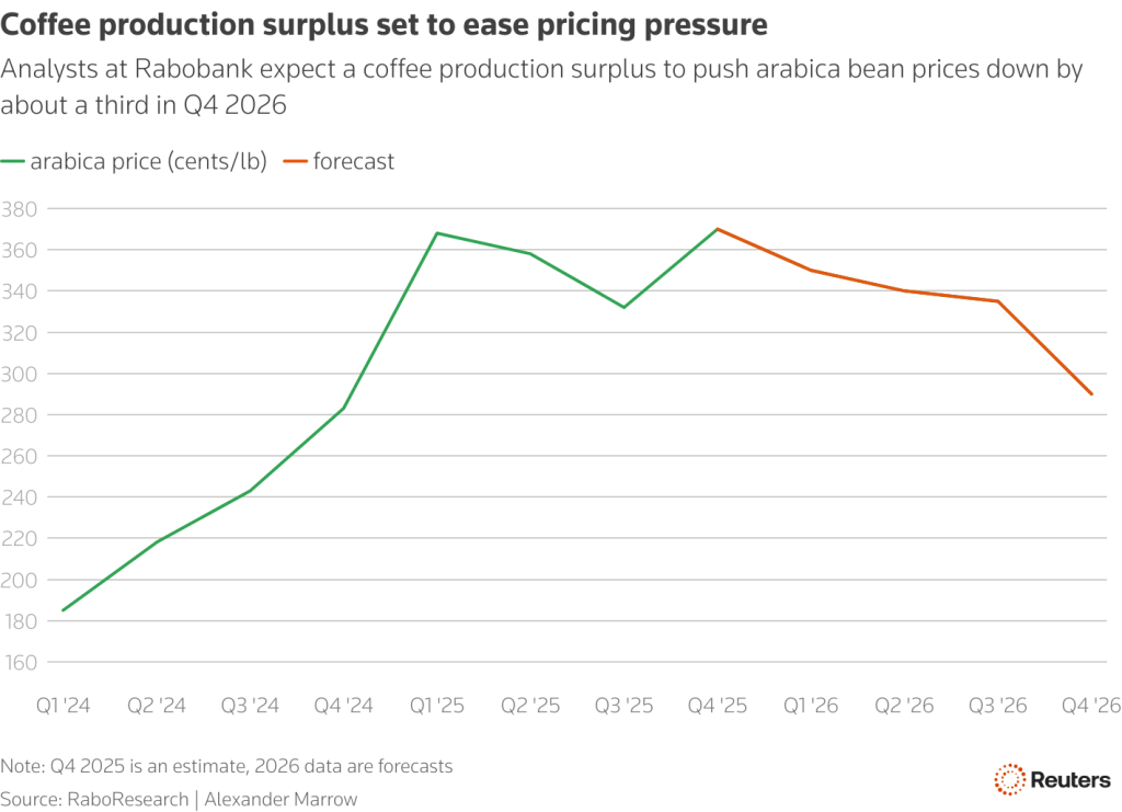 H πιο πάνω γραφική παράσταση δείχνει τις τιμές του καφέ ποικιλίας arabica από το 1ο τρίμηνο του 2024 έως το 4ο τρίμηνο του 2026. Οι τιμές αυξάνονται απότομα έως το 2024, κορυφώνονται στις αρχές του 2025 και, στη συνέχεια, προβλέπεται να μειωθούν κατά περίπου ένα τρίτο έως τα τέλη του 2026, καθώς το πλεόνασμα παραγωγής θα μειώσει την πίεση στις τιμές.