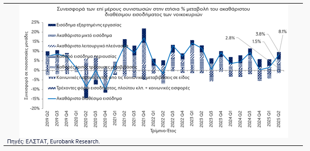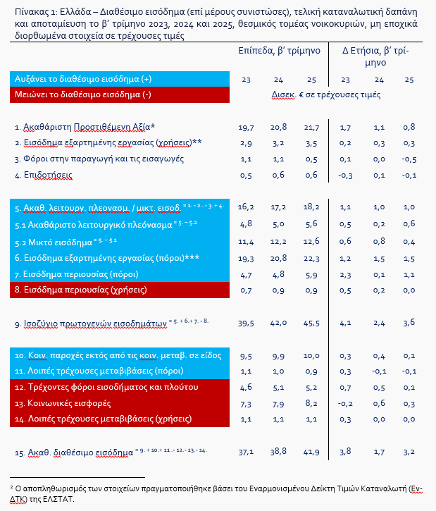 Τέλος, πέραν των αμοιβών εξαρτημένης εργασίας, σημαντική συνεισφορά στην αύξηση του διαθέσιμου εισοδήματος των νοικοκυριών στην Ελλάδα το β’ τρίμηνο 2025 είχαν το εισόδημα περιουσίας (αποδόσεις χρηματοοικονομικών επενδύσεων), το μικτό εισόδημα (κέρδη ατομικών επιχειρήσεων) και το λειτουργικό πλεόνασμα (εισόδημα από την ιδιοκτησία κατοικιών).