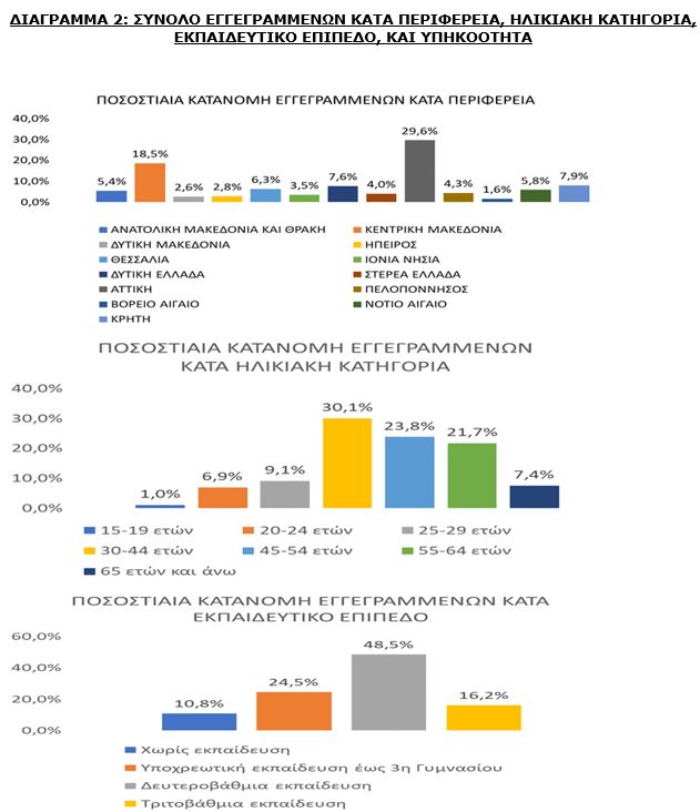 -Η ηλικιακή κατηγορία 30-44 ετών συγκεντρώνει τον μεγαλύτερο αριθμό εγγεγραμμένων μεταξύ των ηλικιακών κατηγοριών ο οποίος ανέρχεται σε 268.986 άτομα (ποσοστό 30,1%).