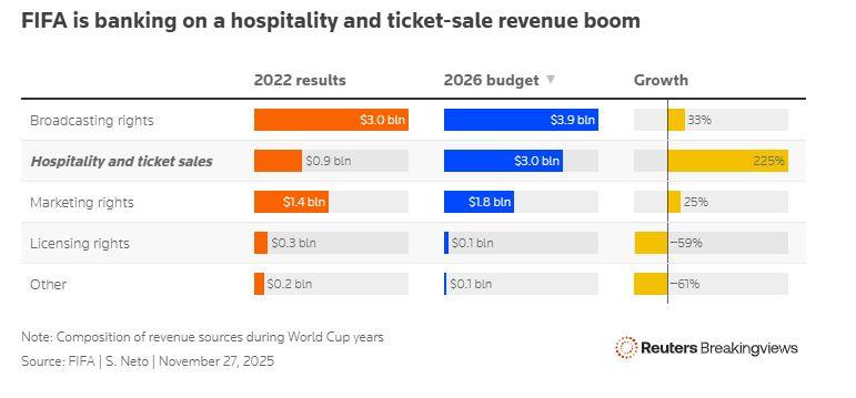 Αυτό ισοδυναμεί με περίπου 50% αύξηση από το 2022, το έτος, του Παγκοσμίου Κυπέλλου του Κατάρ, το οποίο κέρδισε η Αργεντινή του Λιονέλ Μέσι στα πέναλτι. Ο διοικητικός φορέας αναμένει να αποκομίσει το ένα τρίτο των εσόδων του 2026 από τα δικαιώματα φιλοξενίας και την πώληση εισιτηρίων, τα οποία με 3 δισεκατομμύρια δολάρια θα είναι περισσότερο από το τριπλάσιο του αντίστοιχου ποσού από το Κατάρ.