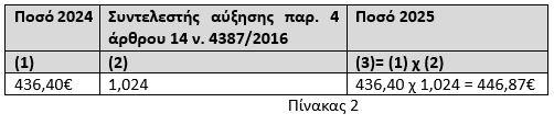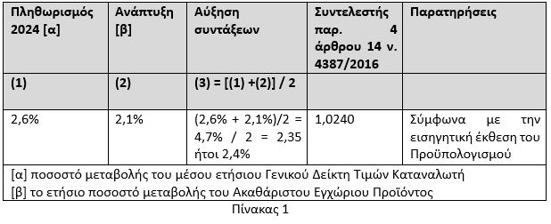 Η αύξηση κατά 2,4% προέκυψε βάσει νόμου (άρθρο 14 ν. 4387/2016) από το άθροισμα του πληθωρισμού και του ρυθμού ανάπτυξης του 2024 διά του 2.