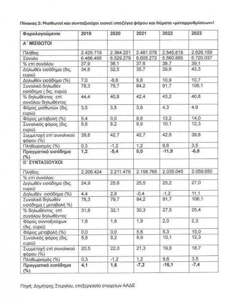 – Χρησιμοποιώντας στοιχεία της ΑΑΔΕ, υπολογίζουμε ότι η φορολογική επιβάρυνση των εισοδημάτων από μισθωτές υπηρεσίες, συντάξεις και επιχειρηματική δραστηριότητα, δηλαδή ο αναλογών φόρος ως ποσοστό των αντίστοιχων φορολογούμενων εισοδημάτων, αυξήθηκε από το 9,9% το 2021 στο 11,1% το 2023. Με βάση τις εκτιμήσεις μας, το 37% της αύξησης αυτής προήλθε από τη μη τιμαριθμοποίηση της φορολογικής κλίμακας, με πλήρη επιβεβαίωση από τα στοιχεία των δικών μου πινάκων.