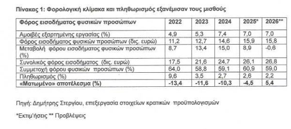 Μάλιστα, για να επιβεβαιώσει η κυβέρνηση τα παραπάνω, στον προϋπολογισμό του 2026 προβλέπει ότι τα έσοδα από φόρο εισοδήματος φυσικών προσώπων (βλέπε πίνακα 1 θα είναι μικρότερα (25,8 δις. ευρώ) από τα αντίστοιχα του 2025 (15,9 δις. ευρώ), τα οποία, όπως τονίζει είναι «αυξημένα κατά 645 εκατ. ευρώ από τον στόχο ή 4,2% κυρίως λόγω της αύξησης των μισθών και των συντάξεων καθώς και της μείωσης της ανεργίας»! Αλλά, μην πολυπιστεύετε τις προβλέψεις (είναι συνεχείς αποκλίσεις) κι από τον επιπρόσθετο λόγο ότι και για το 2026 η ίδια κυβέρνηση διατυμπανίζει ότι θα επαναληφθούν ακόμα εντονότερα οι παραπάνω παράγοντες που προκάλεσαν την παραπάνω απόκλιση στα έσοδα από φόρο εισοδήματος φυσικών προσώπων.