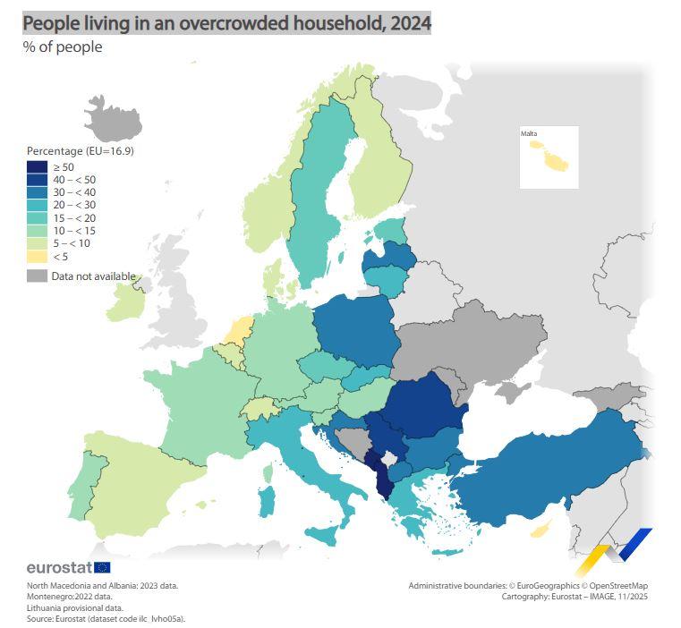 Αξίζει να σημειωθεί ότι πάνω από το 30 % των ατόμων ζούσαν σε συνωστισμένα νοικοκυριά σε πέντε χώρες της ΕΕ. Η Ρουμανία παρουσίασε το υψηλότερο ποσοστό (40,7 %), ακολουθούμενη από τη Λετονία (39,3 %), τη Βουλγαρία (33,8 %), την Πολωνία (33,7 %) και την Κροατία (31,7 %). Σε επίπεδο Ευρώπης το υψηλότερο ποσοστό καταγράφηκε στη Σερβία με 46,6%.