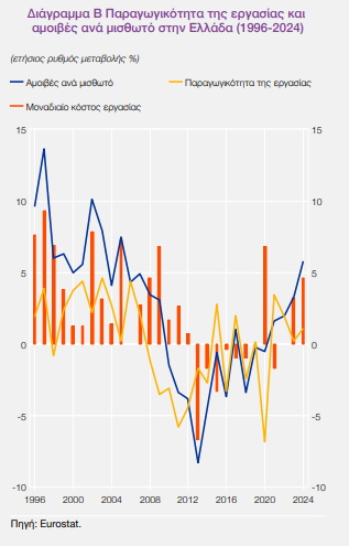 Αιχμές προς την οικονομική πολιτική της κυβέρνησης περιλαμβάνει -επί της ουσίας- μια ειδική έκθεση της Τράπεζας της Ελλάδος, η οποία «μετρά» την παραγωγικότητα στη χώρα μας. Όπως προκύπτει θα έπρεπε να έχουν γίνει μία σειρά από βήματα, τα οποία δεν έχουν γίνει. Μάλιστα, η ΤτΕ αναφέρεται και σε συγκεκριμένες μεταρρυθμίσεις. Μάλιστα, η έκθεση συσχετίζει την άνοδο των μισθών με την αντίστοιχη αύξηση της παραγωγικότητας, κάτι το οποίο έχει πράξει κατά το πρόσφατο παρελθόν ο διοικητής της Τράπεζας της Ελλάδος Γιάννης Στουρνάρας. Σε κάθε περίπτωση παραγωγικότητα της εργασίας στην Ελλάδα παραμένει χαμηλή. Μάλιστα, μετρούμενη σε μονάδες ισοδύναμης αγοραστικής δύναμης, η παραγωγικότητα της εργασίας στην Ελλάδα το 2023 ήταν η χαμηλότερη στην ΕΕ.