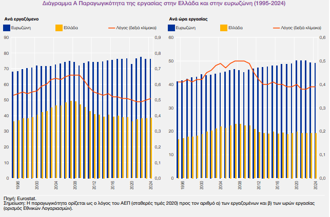 Η παραγωγικότητα της εργασίας παραμένει χαμηλή. Μάλιστα, μετρούμενη σε μονάδες ισοδύναμης αγοραστικής δύναμης, η παραγωγικότητα της εργασίας στην Ελλάδα το 2023 ήταν η χαμηλότερη στην ΕΕ. Η υστέρηση αυτή οφείλεται και στις δύο συνιστώσες της.