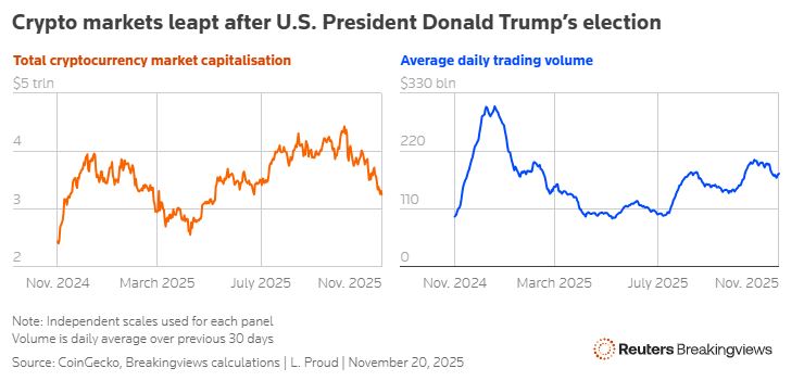 Οι υποστηρικτές των κρυπτονομισμάτων έχουν ήδη πολλούς λόγους για να ευχαριστήσουν τον Τραμπ. Η συνολική αξία των ψηφιακών token, συμπεριλαμβανομένων των bitcoin, ether και άλλων παρόμοιων, αυξήθηκε κατά 1,2 τρισεκατομμύρια δολάρια τους 12 μήνες που ακολούθησαν τη νίκη του στις εκλογές του 2024, σύμφωνα με τα στοιχεία της CoinGecko. Η κυβέρνηση έχει υποστηρίξει τον τομέα και έχει δώσει προτεραιότητα στη νομοθεσία, που έδωσε μια σταθερή νομική βάση στα περιουσιακά στοιχεία που υποστηρίζονται από το δολάριο, γνωστά ως stablecoins. Το Reuters υπολόγισε τον Οκτώβριο ότι η ευρύτερη Trump Organization απέφερε έσοδα 802 εκατομμυρίων δολαρίων το πρώτο εξάμηνο του 2025 από τις κρυπτονομισματικές της δραστηριότητες. Εάν η πρόσφατη πώληση bitcoin και άλλων κρυπτονομισμάτων επιταχυνθεί, ο αρχηγός και η οικογένειά του έχουν ισχυρά κίνητρα να βοηθήσουν.