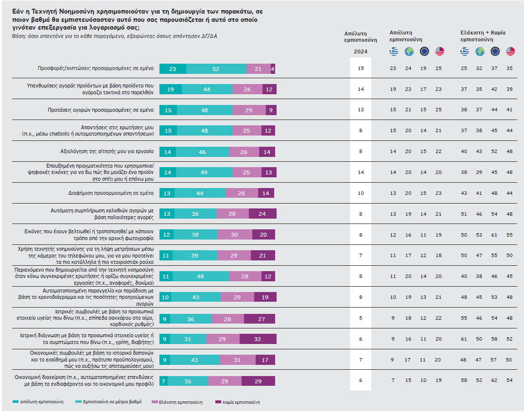 Υψηλότερα επίπεδα εμπιστοσύνης, και αυξημένα σε σχέση με το 2024, καταγράφονται για εφαρμογές που συνδέονται,κυρίως, με τις αγορές: προσωποποιημένες προσφορές και εκπτώσεις (23%, από 15%), υπενθυμίσεις αγοράς προϊόντων με βάση προϊόντα που αγόραζαν τακτικά στοπαρελθόν (19%, από 14%), ή απαντήσεις στις ερωτήσεις τους, όπως μέσω chatbots ή αυτοματοποιημένων απαντήσεων (15%, από 8%).