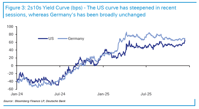 Στις ΗΠΑ, 57 μονάδες βάσης περαιτέρω περικοπών αποτιμώνται για το 2026, εν μέρει λόγω της αναμενόμενης πιο «χαλαρής» στάσης του επικεφαλής της Fed και της διπλής εντολής της Fed που λαμβάνει υπόψη την απασχόληση. Η καμπύλη 2/10ετών είναι τώρα η πιο απότομη από τις αρχές του 2022.