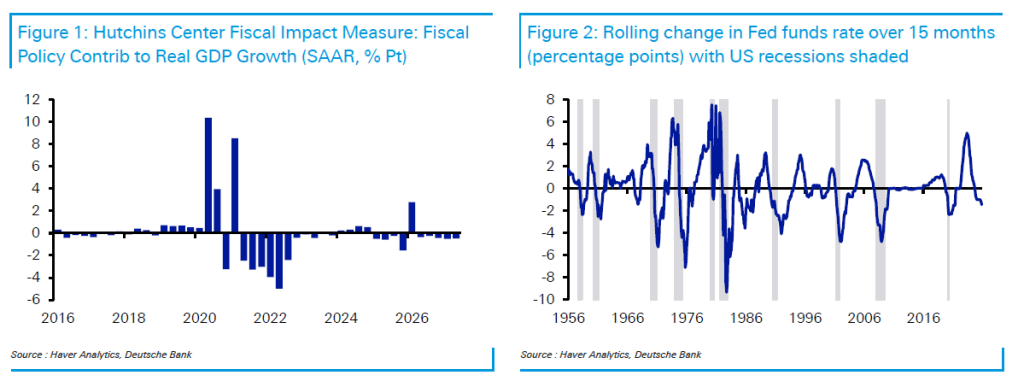 - ΗΠΑ – Δημοσιονομικά: Στο πρώτο τρίμηνο του 2026, αναμένεται η μεγαλύτερη επίδραση από το «Big Beautiful Bill» που ψηφίστηκε τον Ιούλιο. Μερική επίδραση της δημοσιονομικής ώθησης οφείλεται σε τεχνικό «rebound» από το shutdown της κυβέρνησης στις αρχές του τέταρτου τριμήνου, αλλά ακόμη και με αυτό το δεδομένο, η καθαρή επίδραση παραμένει θετική. Αν εξαιρέσει κανείς τα έκτακτα μέτρα λόγω πανδημίας, πρόκειται για την ισχυρότερη δημοσιονομική ώθηση σε ένα μόνο τρίμηνο από την Παγκόσμια Χρηματοπιστωτική Κρίση.