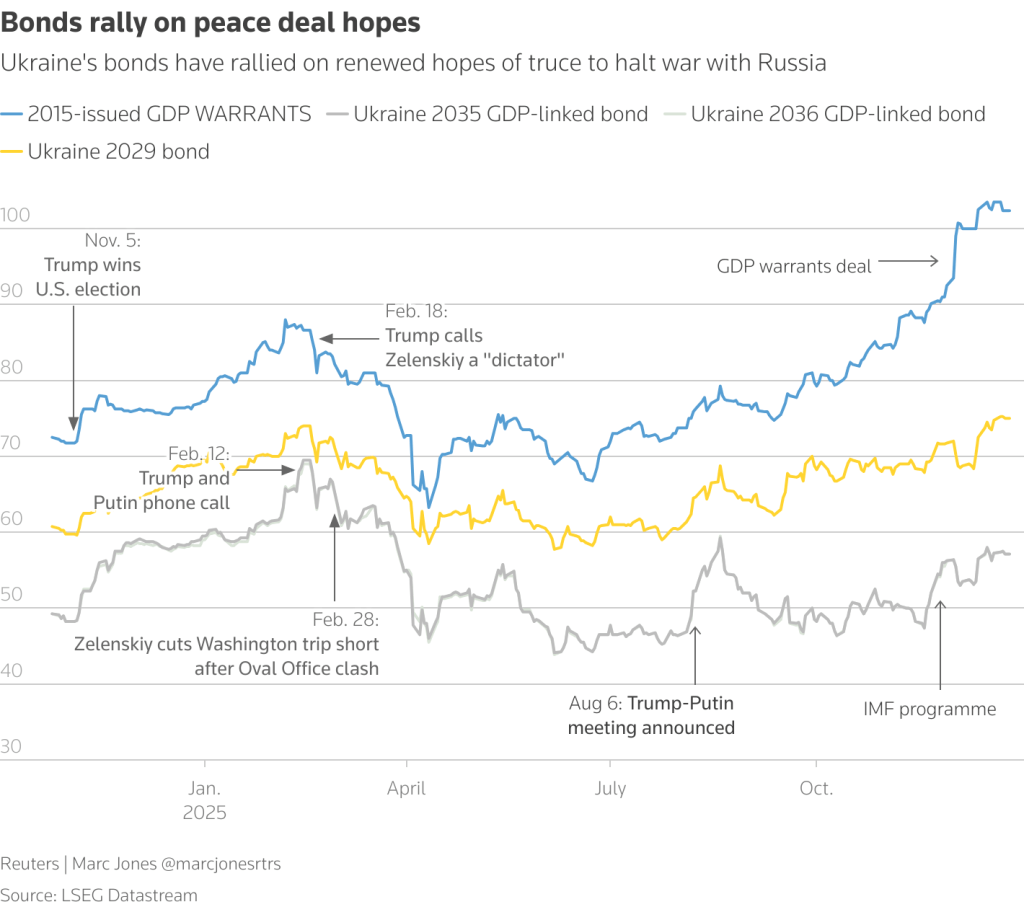 Τα ομόλογα της Ουκρανίας έχουν σημειώσει άνοδο τον τελευταίο ενάμιση μήνα, όπως επισημαίνει το Reuters, εν μέσω μιας νέας προσπάθειας για τον τερματισμό του πολέμου που διαρκεί σχεδόν τέσσερα χρόνια, και τα περισσότερα σημείωσαν άνοδο κατά 1 σεντ το δολάριο, τη Δευτέρα, μετά από ένα πολυάσχολο διπλωματικό Σαββατοκύριακο.