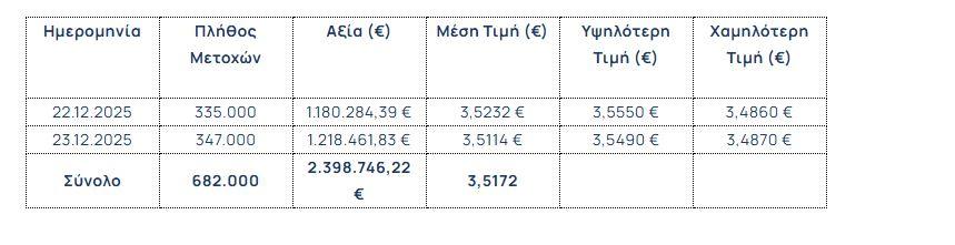 Η «Τράπεζα Eurobank Ανώνυμη Εταιρεία» (εφεξής η «Eurobank» ή η «Τράπεζα»), σε συνέχεια της από 12.12.2025 ανακοίνωσής της σχετικά με την έναρξη εφαρμογής του Προγράμματος Επαναγοράς Ιδίων Μετοχών («Πρόγραμμα»), το οποίο εγκρίθηκε με την απόφαση της Έκτακτης Γενικής Συνέλευσης των Μετόχων της Τράπεζας στις 22.10.2025, σύμφωνα με το άρθρο 49 του ν. 4548/2018, σε συνέχεια του αντίστοιχου προγράμματος της «Eurobank Ergasias Υπηρεσιών και Συμμετοχών Ανώνυμη Εταιρεία» («Eurobank Holdings») που θεσπίστηκε με την απόφαση της από 30.04.2025 Τακτικής Γενικής Συνέλευσης των Μετόχων της τελευταίας, και σε συνέχεια της από 22.10.2025 απόφασης του Διοικητικού Συμβουλίου της, ενημερώνει το κοινό ότι κατά το διάστημα 22.12.2025 – 26.12.2025 απέκτησε συνολικά, στο πλαίσιο του Προγράμματος, 682.000 μετοχές εκδόσεως της ιδίας («Ίδιες Μετοχές») που διαπραγματεύονται στο Χρηματιστήριο Αθηνών («Χ.Α.»), με μέση τιμή κτήσης €3,5172, ανά μετοχή και συνολικό κόστος €2.398.746,22.