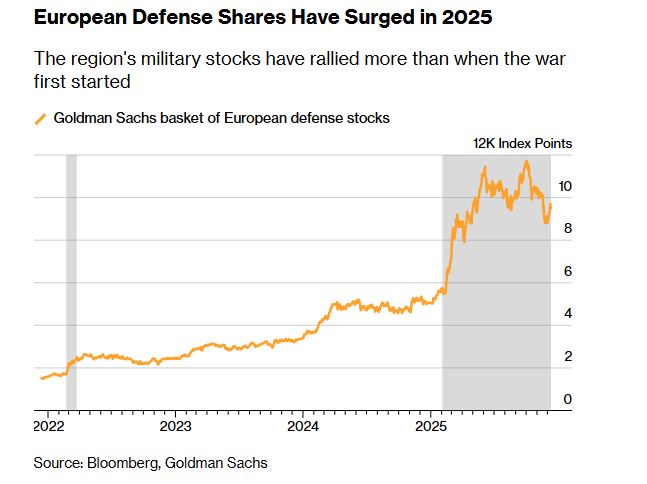 Τα σχέδια του Τραμπ να αποσυρθεί από τη χρηματοδότηση του στρατού της Ουκρανίας οδήγησαν τις ευρωπαϊκές κυβερνήσεις σε μια έξαρση δαπανών, δίνοντας τεράστια ώθηση στις μετοχές των περιφερειακών αμυντικών εταιρειών — από την άνοδο περίπου 150% από την αρχή του έτους της γερμανικής Rheinmetall στις 23 Δεκεμβρίου, έως την άνοδο άνω του 90% της ιταλικής Leonardo.