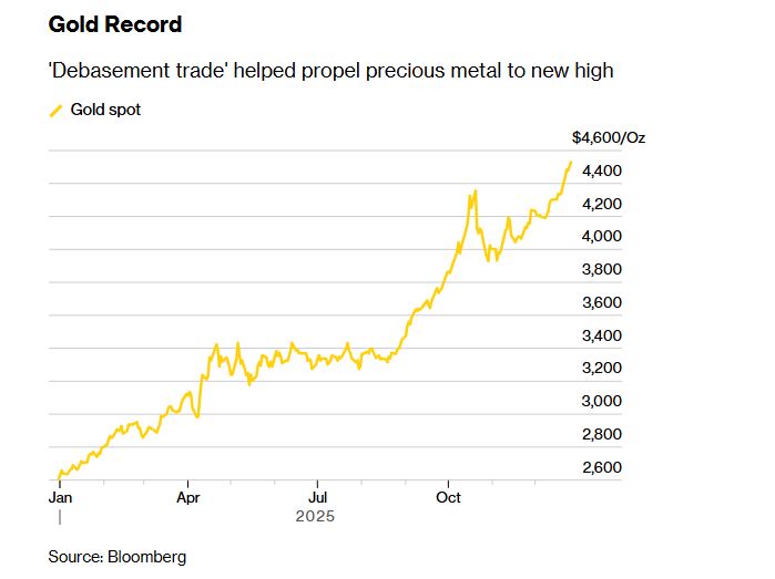 Η κατάσταση έφτασε στο αποκορύφωμά της τον Οκτώβριο, όταν οι ανησυχίες για τις δημοσιονομικές προοπτικές των ΗΠΑ συνέπεσαν με το μακροβιότερο κλείσιμο της κυβέρνησης που έχει καταγραφεί ποτέ. Οι επενδυτές αναζήτησαν καταφύγιο μακριά από το δολάριο. Εκείνο τον μήνα, τόσο ο χρυσός όσο και το Bitcoin σημείωσαν ρεκόρ — μια σπάνια στιγμή για περιουσιακά στοιχεία που συχνά θεωρούνται ανταγωνιστικά.