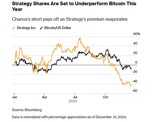 Οι μετοχές της Strategy έφτασαν σε ρεκόρ τον Ιούλιο, σημειώνοντας κέρδη 57% από την αρχή του έτους, αλλά καθώς ο αριθμός των εταιρειών διαχείρισης ψηφιακών περιουσιακών στοιχείων εκτοξεύθηκε και οι τιμές των κρυπτονομισμάτων έπεσαν από τα υψηλά τους επίπεδα, οι μετοχές της Strategy — και εκείνες των μιμητών της — άρχισαν να αντιμετωπίζουν πρόβλημα και η υπεραξία της εταιρείας σε σχέση με το Bitcoin συρρικνώθηκε. Το στοίχημα του Chanos απέδωσε.