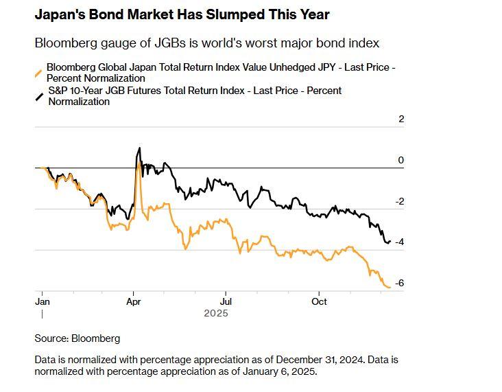 Το 2025, οι αποδόσεις των κρατικών ομολόγων αναφοράς αυξήθηκαν σε όλα τα επίπεδα, καθιστώντας την αγορά χρέους της Ιαπωνίας, αξίας 7,4 τρισεκατομμυρίων δολαρίων, το όνειρο κάθε short seller, για πολλούς λόγους. Οι αποδόσεις των 10ετών ομολόγων της Ιαπωνίας (JGB) ξεπέρασαν το 2% και έφτασαν σε επίπεδα που δεν είχαν παρατηρηθεί εδώ και δεκαετίες, ενώ οι αποδόσεις των 30ετών ομολόγων έφτασαν σε ιστορικά υψηλά επίπεδα. Ο δείκτης Bloomberg για τις αποδόσεις των ιαπωνικών κρατικών ομολόγων υποχώρησε κατά περισσότερο από 6% φέτος έως τις 23 Δεκεμβρίου, κατατάσσοντας την Ιαπωνία ως την αγορά με την χειρότερη απόδοση στον κόσμο.