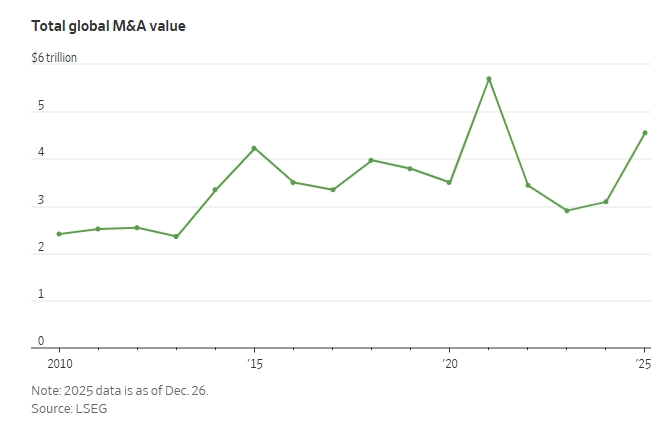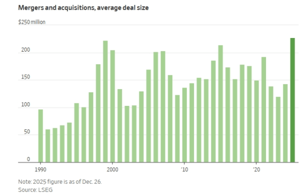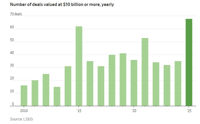 Σύμφωνα με τα στοιχεία του Χρηματιστηρίου του Λονδίνου (LSEG -London Stock Exchange Group) , που χρονολογούνται από το 1980, φέτος ανακοινώθηκαν παγκοσμίως 68 συναλλαγές αξίας 10 δισεκατομμυρίων δολαρίων ή περισσότερο, αριθμός που αποτελεί ρεκόρ, σημειώνει η Wall Street Journal. Αυτό οδήγησε το μέσο ετήσιο μέγεθος των συναλλαγών σε ένα νέο υψηλό επίπεδο, σχεδόν 227 εκατομμύρια δολάρια.