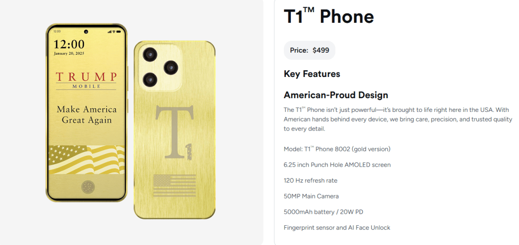 Η συσκευή «T1», μαζί με ένα πρόγραμμα κινητής τηλεφωνίας με κόστος 47,45 δολάρια το μήνα, που ανακοινώθηκε τον Ιούνιο, ήταν μία από τις πολλές προσπάθειες της οικογενειακής επιχείρησης Trump να επωφεληθεί από την επιστροφή του στον Λευκό Οίκο.