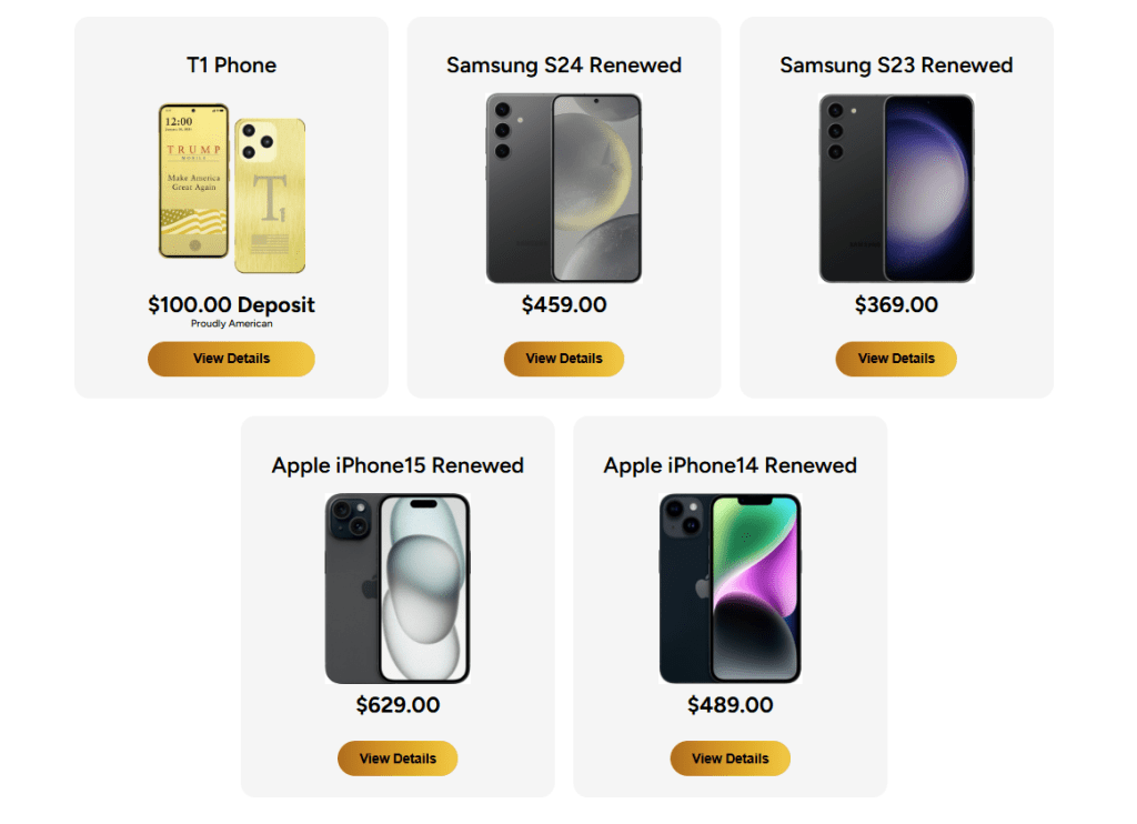 Η Trump Mobile πωλεί επίσης μεταχειρισμένα μοντέλα του Samsung S24, που κυκλοφόρησε στις αρχές του 2024, για 459 δολάρια, ελαφρώς χαμηλότερη από την τιμή μιας μεταχειρισμένης έκδοσης της ίδιας συσκευής από τον ιστότοπο της Samsung, όπου η τιμή της είναι 489 δολάρια.