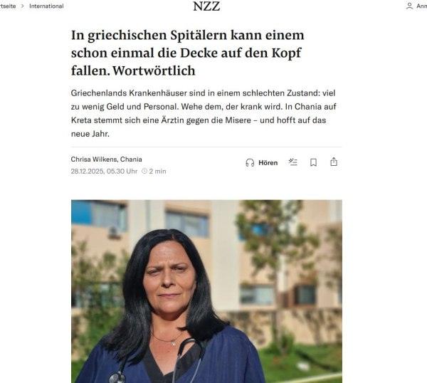Το ρεπορτάζ για την κατάρρευση του Εθνικού Συστήματος Υγείας (ΕΣΥ) , υπογράφει η Χρύσα Βίλκενς, ανταποκρίτρια της εφημερίδας στην Ελλάδα και συνεργάτιδα πολλών γερμανόφωνων ΜΜΕ. «Τα νοσοκομεία της Ελλάδας βρίσκονται σε άσχημη κατάσταση, με ελλείψεις χρηματοδότησης και προσωπικού. Αλλίμονο σε όποιον αρρωστήσει. Στα Χανιά της Κρήτης, μια γιατρός αντιστέκεται στη δυστυχία και ελπίζει στο νέο έτος», γράφει η NZZ.