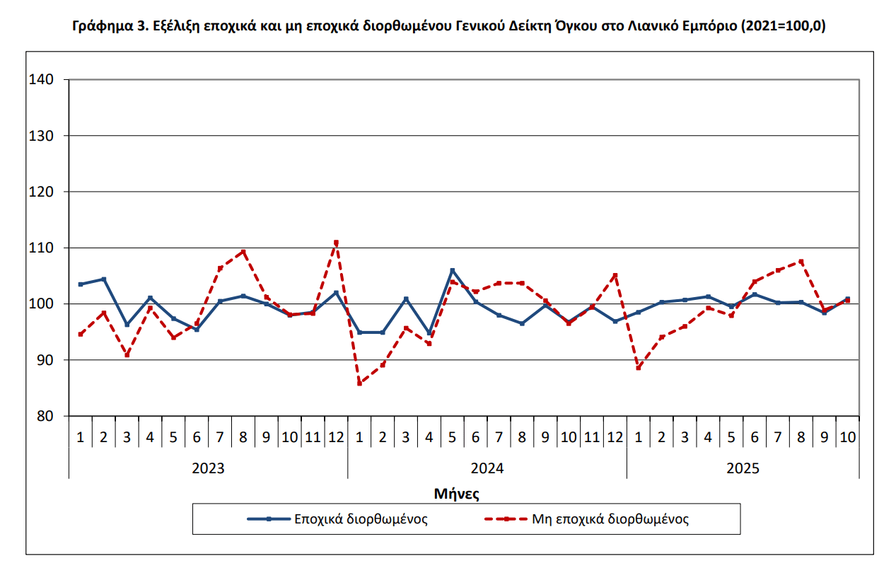Ο εποχικά διορθωμένος Γενικός Δείκτης Όγκου, κατά τον μήνα Οκτώβριο 2025, σε σύγκριση με τον αντίστοιχο δείκτη του Σεπτεμβρίου 2025 παρουσίασε αύξηση 2,5%.