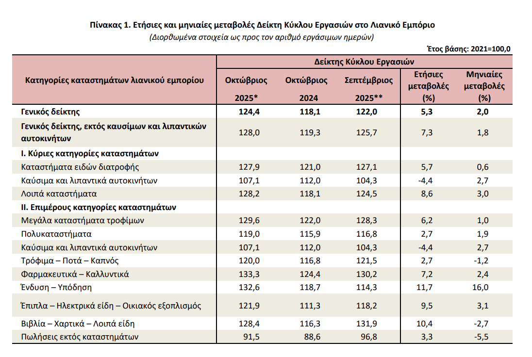 Ειδικότερα, σύμφωνα με την ΕΛΣΤΑΤ, ο Γενικός Δείκτης Κύκλου Εργασιών κατά τον μήνα Οκτώβριο 2025, σε σύγκριση με τον αντίστοιχο δείκτη του Οκτωβρίου 2024, παρουσίασε αύξηση 5,3% και σε σύγκριση με τον αντίστοιχο δείκτη του Σεπτεμβρίου 2025 αύξηση 2,0%.